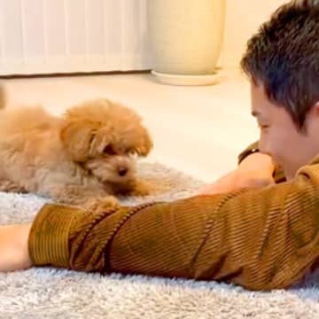 酔っぱらったパパが『生後3ヶ月の子犬』に絡んだ結果…まさかの『遊び方』がクセ強すぎると375万再生「どんな遊びw」「運動神経抜群」と爆笑