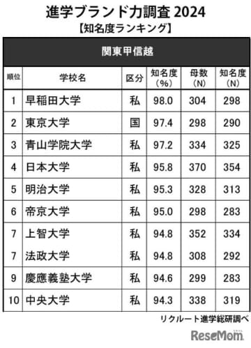 リクルート進学総研の「進学ブランド力調査2024」の結果、関東甲信越エリアの高校生が選ぶ知名度が高い...