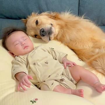 赤ちゃんが寝ている間に大型犬がしていること…優しすぎる『まさかの配慮』が尊すぎると20万再生「遠慮がちで可愛い」「なんて微笑ましいの」