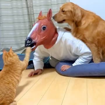 犬と猫は『部屋に馬の化け物がいたら』どうする?検証した結果…まさかの反応と可愛い結末が67万再生「お父さん最高w」「襲われるの爆笑」