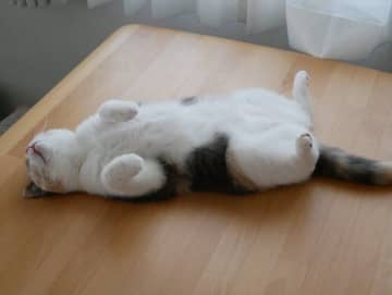 部屋に戻ると爆笑の光景が! テーブルのど真ん中でひっくり返って熟睡する猫の姿が「怠惰の極み」すぎた