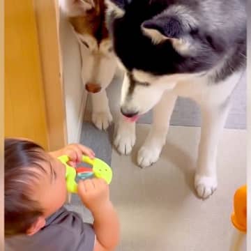 Instagramに投稿されたのは、ワンコたちが赤ちゃんの遊びに付き合う光景です。赤ちゃんがおもちゃ...