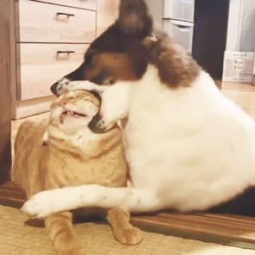 『食べちゃいたいくらい猫が好きな犬…』熱烈スキンシップが718万再生「可愛すぎるw」「想像以上に食べられてて草」爆笑の声