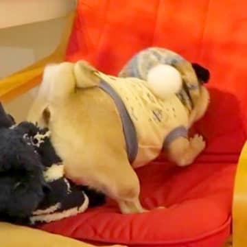 YouTubeチャンネル『ストーカー犬 ぷぅ [パグ Pug]』に投稿された、パグがパパのおつまみを...
