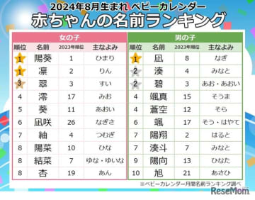 育児支援サイトを運営するベビーカレンダーは、2024年8月生まれの赤ちゃんの名前ランキングを発表した...