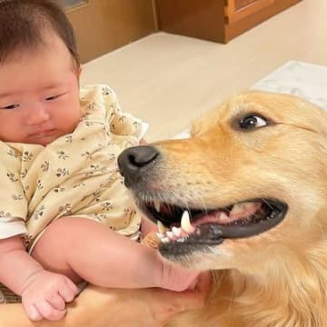 赤ちゃんのことが大好きな大型犬の様子が、YouTubeチャンネル「豆柴うに&ゴールデンレトリバーおか...
