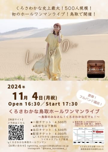 くろさわかな鳥取ホールワンマンライブ~鳥取のみなさん!くろさわかなだでぇ!~が2024年11月4日(月・祝)に開催|鳥取市