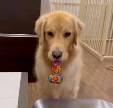 オモチャをくわえて「遊ぼう」と目で訴える犬、次の瞬間→「まさかの登場」にびっくり&爆笑!