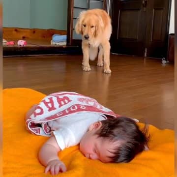 赤ちゃんが電池切れしていたら、大型犬が…『心配で様子をうかがう姿』が優しすぎると89万再生「フリーズしてるの可愛いw」「心が潤った」