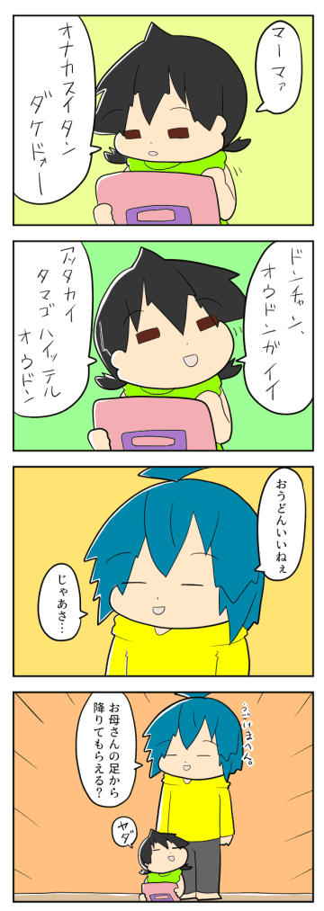 作りたいけど作れない!うどん作ってと催促するが母の足の上からおりてくれない6歳娘|mochikoの育児マンガ