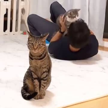 『娘(猫)にチュッチュしてるパパ』を盗撮したら"兄猫"も一緒で…爆笑の『温度差』が92万再生「後ろでイチャイチャw」「顔が…ww」