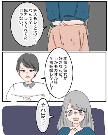 前回の話夫から「子どもがもうすぐ産まれる。もう8カ月になる」と言われたかおる(私)。子どもが欲しいと...