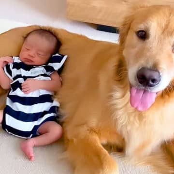 Instagramに投稿されたのは、赤ちゃんに寄り掛かられて優しく受け入れるゴールデンレトリバーさん...