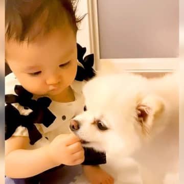 どうしても犬にご飯をあげたい赤ちゃんが…まさかの『丁寧すぎる与え方』とワンコの反応が24万再生「付き合ってあげるの可愛いw」「仲良しコンビ」