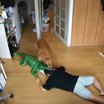 飼い主が『ワニに襲われてるドッキリ』してみたら、猫と犬が…部屋に入ってきたときの反応に「かわゆすww」「爆笑してしまった」と反響続々