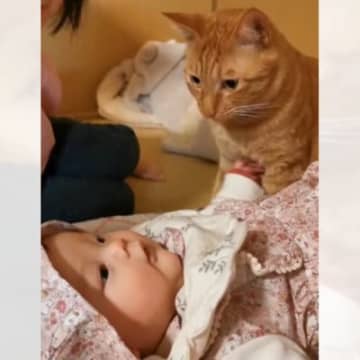 「この小さな可愛い子はだれ?」お家にやって来た友人の赤ちゃんが気になり過ぎる猫さん。 匂いを嗅ぎ、泣...