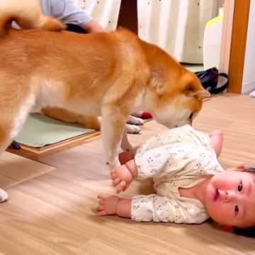 寝返り練習中の赤ちゃんが『どうしても犬に触りたい』と頑張っていたら…まさかの結末が39万再生「たまらん可愛さ…」「すごすぎる」と大絶賛