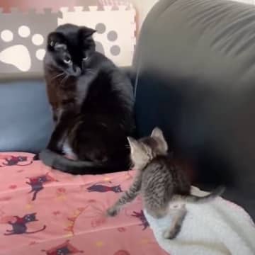 先輩にちょっかいをかけようとしたら、『無言の圧』を受けた子猫…予想外すぎる行動をとる姿に「遠くからワロタ」「本当にかわいすぎ!」の声