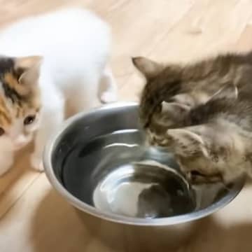 「みんな一緒の行動が可愛いww」たくさん水を飲んだ3匹の子猫が…"まさかの光景"に「ホームのようにw」「足痺れるw」と笑顔になる人続出