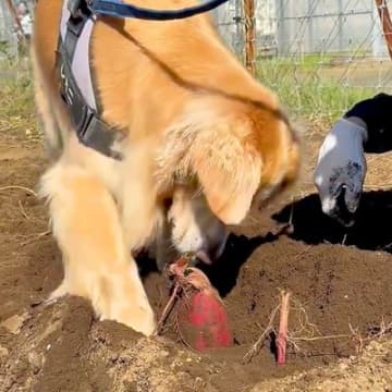 芋掘りをしに行ったら、大型犬が…一生懸命に『お手伝いする光景』に癒されると317万表示「丁寧に掘ってて偉い」「優しいw」大絶賛の声