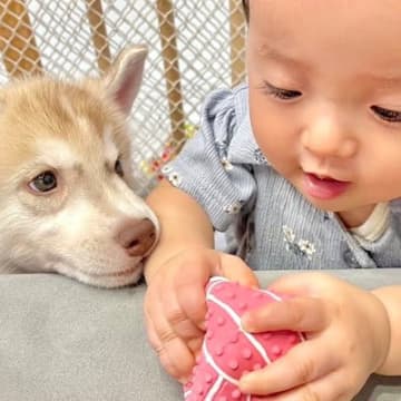 ハスキー兄妹さんと赤ちゃんとの微笑ましい日常が、YouTubeチャンネル「もんちゃんっていうよ。」に...
