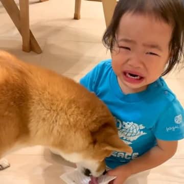 2歳の女の子が『イヤイヤ期で大号泣』していたら、犬が…まさかの『特効薬』になる光景が12万再生「ピタッと泣き止むのすごい」「優しさ…」