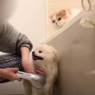 犬のことをシャンプーしていたら、弟想いの猫が…素敵すぎる光景に「なんて可愛い関係性」「思わず笑顔になった」と7万5000再生を突破