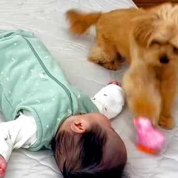 寝ている赤ちゃんの横でおもちゃが動き出したら、犬が…咄嗟に見せた『まさかの行動』が109万再生「有能すぎる」「最高のボディーガード」