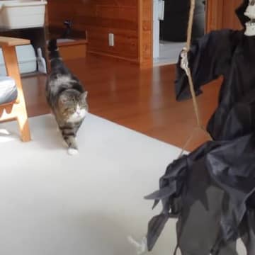 『骸骨おばけドッキリ』を仕掛けたら、猫が…予想外すぎる『嘘みたいな展開』に爆笑の声「もしかして圧かけてる?w」「人生何周かしてそう」