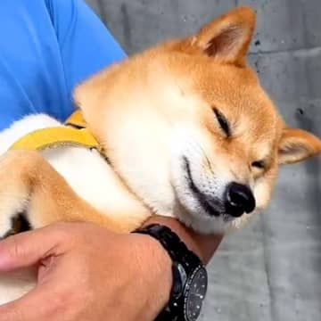 お出かけの途中で抱っこされた犬が…ここぞとばかりに見せた『まさかの仕草』が10万再生「薄目開けてて草」「人間の子どもと一緒w」と大絶賛