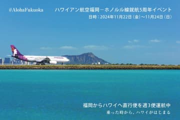 ハワイアン航空は、福岡~ホノルル線の就航5周年を記念したイベントを、11月22日から24日に大丸福岡...