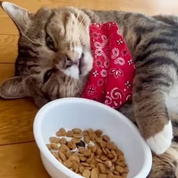 『ふりかけ』を盗み食いしようとした猫→犯行がバレて…可愛すぎる『ごまかし方』に爆笑!87万再生の大反響「最強に可愛いw」「もはや狸で草」