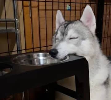飼い主の帰宅を待つもウトウトしてしまった子犬 ゴハンの台をくわえて眠り出す衝撃の姿に「なんだその寝方!」とツッコミ
