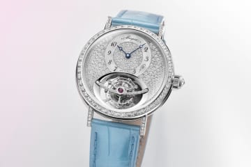 ブレゲ「クラシック トゥールビヨン」ダイヤモンドを敷き詰めた腕時計、スカイブルーのレザーストラップで