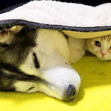 トイレの後、コタツに入ろうとしたら犬と猫が…まさかの『満員御礼な光景』が尊すぎると4万再生「天使の集う場所」「たまらん可愛さ」と悶絶