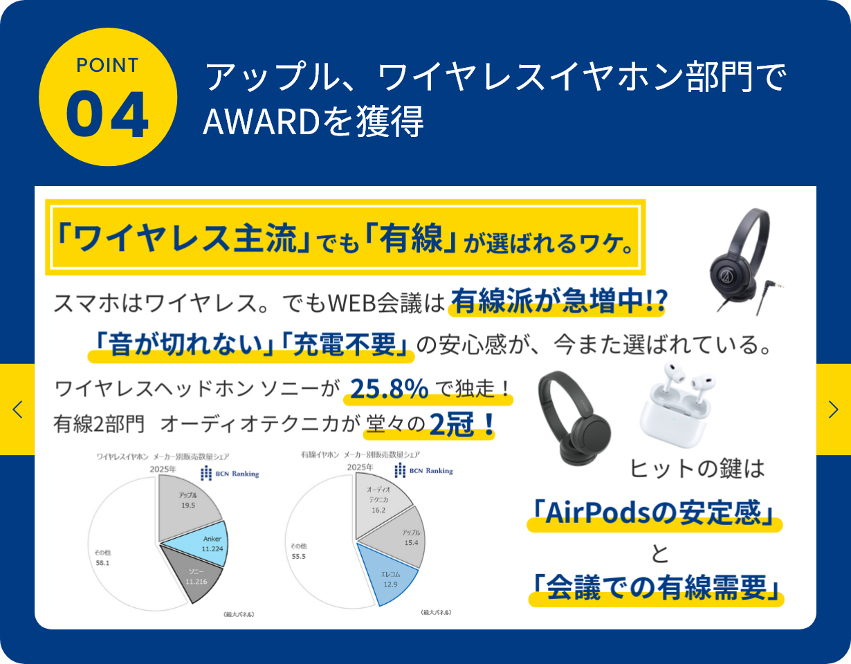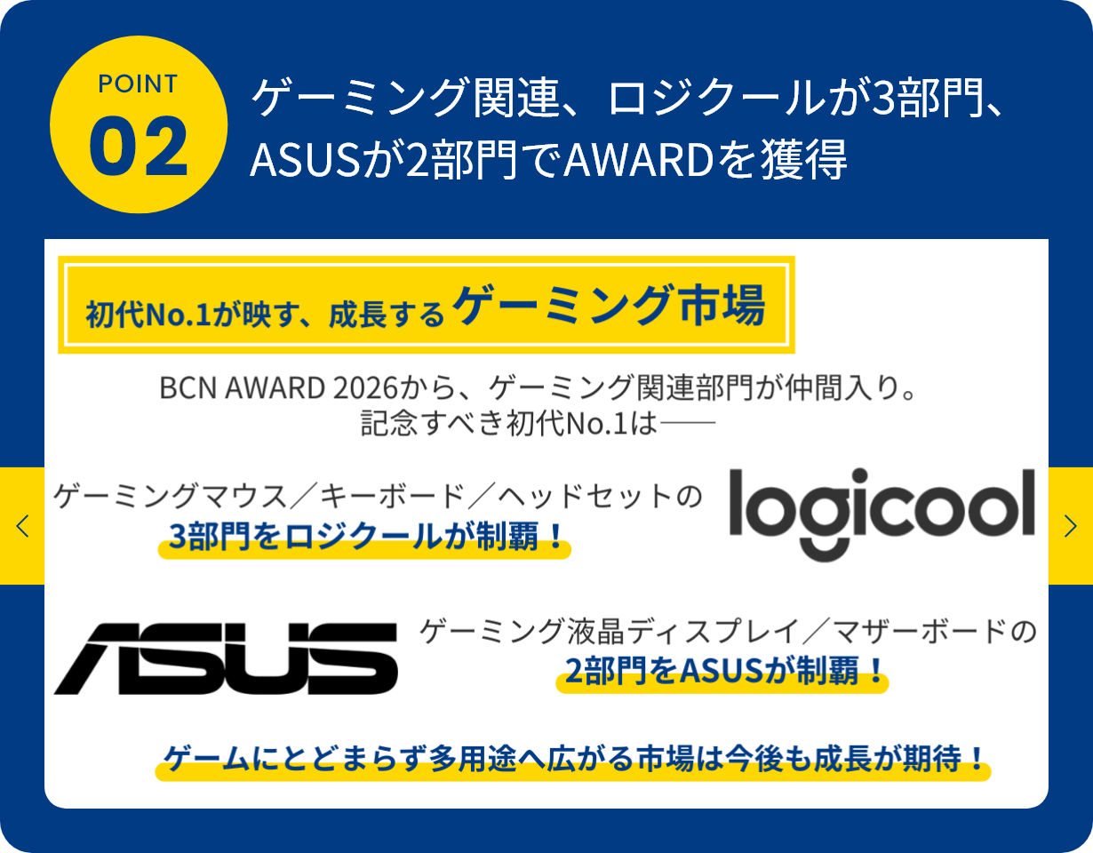 「BCN AWARD」は、全国の量販店のPOSデータを日次で収集・集計した「BCNランキング」に基づき、パソコン関連・デジタル家電関連製品の年間(1月~12月)販売数量No.1のメーカーを称えるものです。