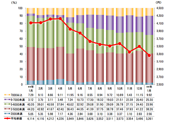- 価格帯別の販売比率や平均単価推移