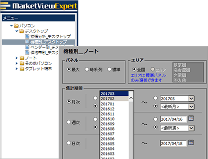 専用分析ツール(Market View Expert、略称MVE)をご利用いただき、製品の販売実績だけではなく、メーカー別、シリーズ別、スペック(タイプ)別など、さまざまな角度からデータを分析できる、フル機能のサービスです。EXCELファイルをダウンロードしての加工や、軸や項目を縦横任意に設定するクロス集計などが可能です(一部機能はオプション)。