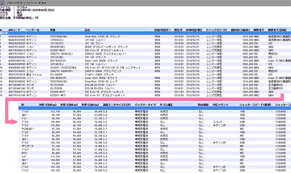 価格帯別、サイズ別、シリーズ別など、アイテムごとに多彩なスペック分析が可能です。自由度の高い集計結果データをEXCELで出力します。
