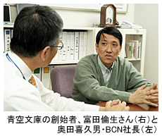 ゲスト:青空文庫の創始者 富田倫生 VS ホスト:BCN社長 奥田喜久男 青空文庫創始者の富田倫生さんを迎えての対談の第二弾(前回)。自著「パソコン創世記」を後世に残そうという思いから電子本にたどり着き、やがて古典名著を万人共有の文化としていきたいとの意思が青空文庫の原型を誕生させた。今回は、青空文庫の運営の実際、そして今後の展望などについて語ってもらった。【取材:2007年1月17日、BCN本社にて】
