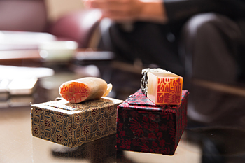 松下社長が台湾のグループ会社を訪れた際、空いた時間に街を散歩していてふと思い立ち、つくってもらったという印鑑。どちらも姓名が篆刻されているが、書類によって、座りのいいほうを選んで押印しているのだとか。