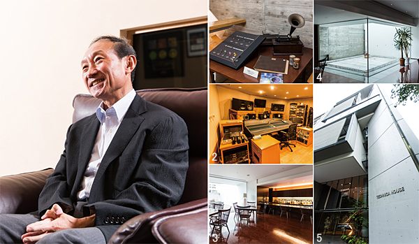 写真1~5 大通り(本郷通り)を挟んで東京医科歯科大学を見渡す湯島1丁目にある“かっこいい”ビル。そのビルは外観をスピーカーに模したという「テクニカハウス」だ。内部には、こだわりの音に関する機器が装備されている。心地よい音を聴いた会議の後は酒を酌み交わす習慣があるそうで、最上階にはバーがしつらえてある。
