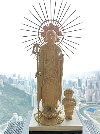 小間さんが事業家としての考え方を教わったというお祖父さま手彫りの像。優しい表情と見事な後光が印象的。繊細な後光を壊さないよう、お住まいの香港に移動する際には、ハンドキャリーで大切に運ばれたのだとか。