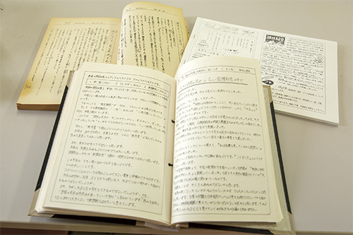 奥に映っている2点の印刷物は家庭向けのプリント、手前の冊子は職員向けの週報。いずれも三幣先生の手書きによるものだ。発行頻度が最も高かったのは、木更津の小学校に勤務していた30代後半の時代で、最高で年間250枚! ほぼ毎日のペースである。「4年間で1000枚を目指したが果たせなかった」とは三幣先生の弁。いやはやすごいアウトプットの量です。
