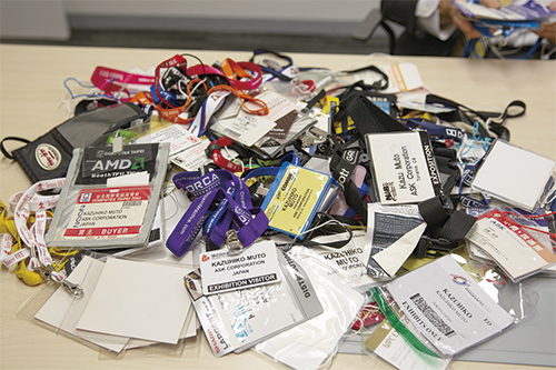 武藤さんが、かつてのCOMDEXやCESをはじめとする展示会に参加したときの名札パス。国内外を問わず、出展者として、またビジターとして会場を訪れたときのもののほんの一部だそうだ。「記憶に残そうと思って捨てないでおいた」と武藤さんは言うが、このパスケースの山は会社に大きな資産をもたらしたに違いない。