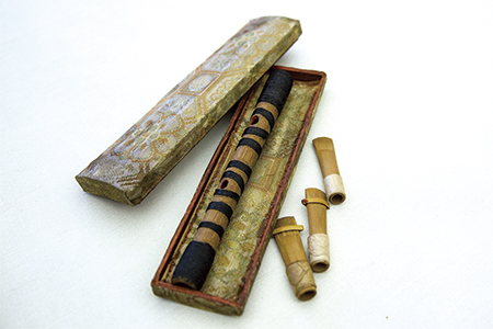 不得手な篳篥(ひちりき)について雅楽の恩師・東儀博先生に教えを乞うたところ、それを手作りしようという話になり、教わりながら作ったもの。葦笛は、音色が力強いのになぜか柔らかさが心に染み入る。入れ物はカステラの空き箱を利用して先生が作ってくださった。