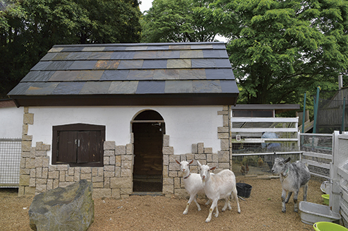 もくもく村には自然がいっぱいだ。敷地内を流れる小川にはメダカが泳ぎ、絶滅危惧種のモリアオガエルのオタマジャクシが群れをなす。極めつけは無添加住宅仕様の動物小屋で飼われているヤギである。自然と共生することの大切さを、お客様にも体感していただきたいと思っています。住人のヤギに直接聞いたわけではないけれど「健康で幸せな生活を送っているよ」と言っているみたいです(笑)。と山根社長。