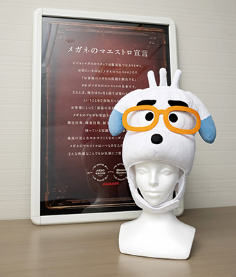 ビジョンメガネのキャラクター「ビジョンくん」の被り物。「ゆるキャラグランプリ」への出場を目指して製作されたので本体部分も存在する。安東さんはかつて、三重県で開催されたハーフマラソンにこれを被って出場。ただし、暑すぎて途中からは小脇に抱えて走ったそう。ビジョンくんの後ろの額は、同社が掲げる「メガネのマエストロの5ケ条」