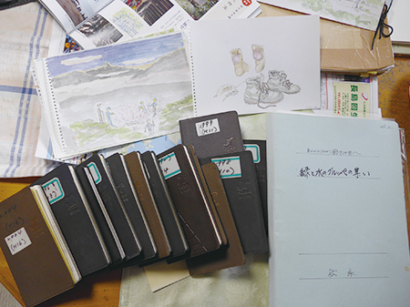 松永さんが作成された資料の一部。手前左は商工会議所時代の手帳群、その右は山の仲間と結成したグループの記録。奥に見えるイラストは松永さんが出版された画集の原画。ほかにも山行記録や執筆されていた新聞のスクラップ等々が几帳面に保存されている。あっという間に机が覆い尽くされてしまった。