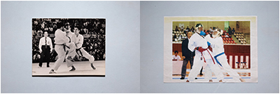 左写真は、1970年に行われた第1回世界空手道選手権個人戦決勝での和田さん(右)。右写真は、2008年の第9回日本スポーツマスターズ空手道組手4部決勝での和田さん(右)。52年前の世界選手権は、防具なしの「素手」「素面」で行われていた。